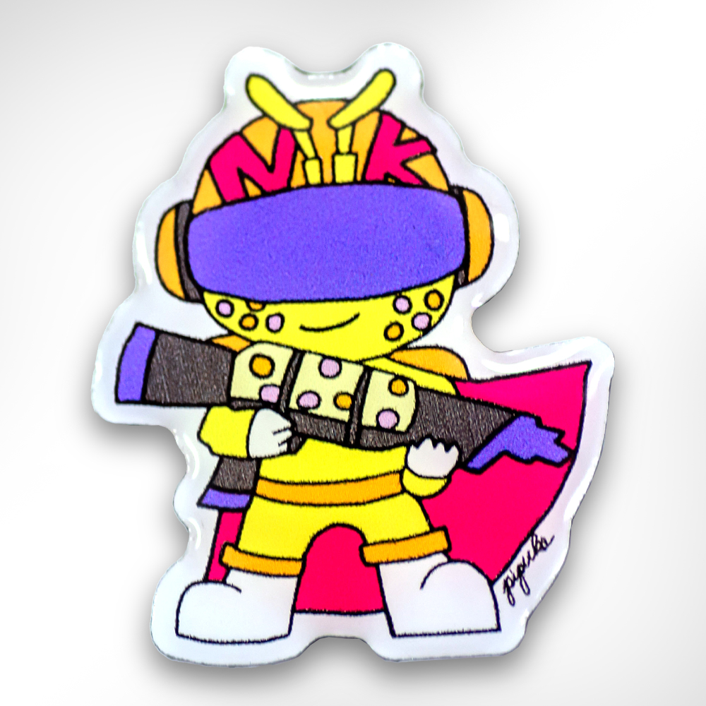 ピンバッジにするデザインは、NK 細胞の機能を擬人化したキャラクター「NKman」です。もともとは、好酸球の研究をアピールする活動をしている「EOSMAN(好酸球くん)」をオマージュして生まれたキャラクターだそうです。「NKman」のイラストは、NK 細胞の機能をキャラクターデザインに落とし込んでいるため、細かな描き込みが多く、色も大切な要素の一つとなっています。そこでバッジ仕様は、繊細な線や配色を忠実に表現するために、元のイラストをそのまま再現できる印刷仕上げのバッジ仕様をお勧めしました。