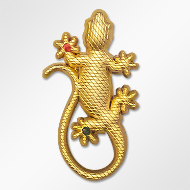 バッジ製法では、通常の金属プレスでの成形よりも肉薄で精度が得られる、金型を使った高圧鋳造(ダイキャスト)を選択し、複雑な形や模様、質感をしっかり表現。左手、左足部分には、ルビーとエメラルドの宝石を埋め込み、ヤモリの特徴を押さえつつも、装飾品として洗練された仕上がりとなりました。