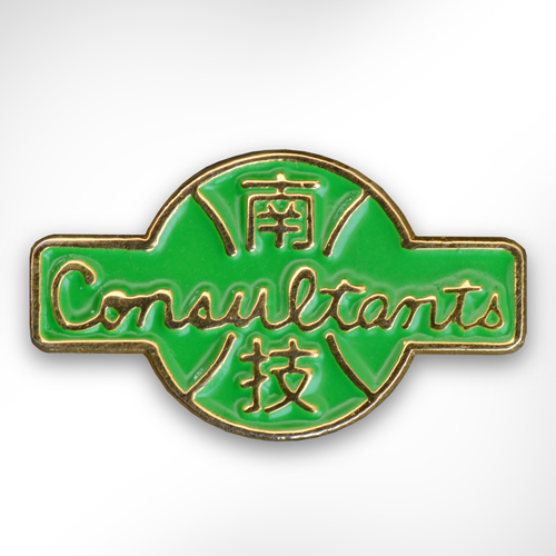 社章デザインは、社名ロゴマークをモチーフにしたものです。字画の多い「南」「技」の漢字と、筆記体で記された「Consultants」の英字を組み合わせた細かなロゴデザインを、限られたバッジサイズの中に表現することが課題でした。細めの線でデザインしたので、線が途切れたり、つぶれたりせず再現できるように注意して製作させていただきました。また、あえてエポキシ樹脂でのコーティングをせずに凹凸の陰影を生かしたことで、繊細なデザインながら立体的で存在感のある仕上がりとなっています。バッジ裏の付属品は、針で差しとめるタイプのタイタックを選択。衣服を選ばずに社章を装着していただくことができます。