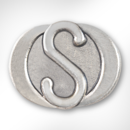 社章のモチーフとなったのは、アルファベットの「O」と「S」を印象的に配したロゴマークです。よくご要望をいただく社章の仕様として、凹凸の段差で立体感を表現する平彫りがあります。ただ、今回はアルファベット部分をより立体的にというご希望がありましたので、凹凸の凸部分に山なりのカーブをつける肉彫りをお勧めしました。また、「O」と「S」の仕上げ面に高低差をつけ、渋い濃淡が魅力の銀いぶし加工を施すことで、さらにデザインにメリハリがつき、より立体的な仕上がりとなっています。社章を留めるための裏付属品には、針で差し留めるタイプのタイタックをお選びいただいています。こちらは衣服を選ばずに装着できる仕様の留め具です。